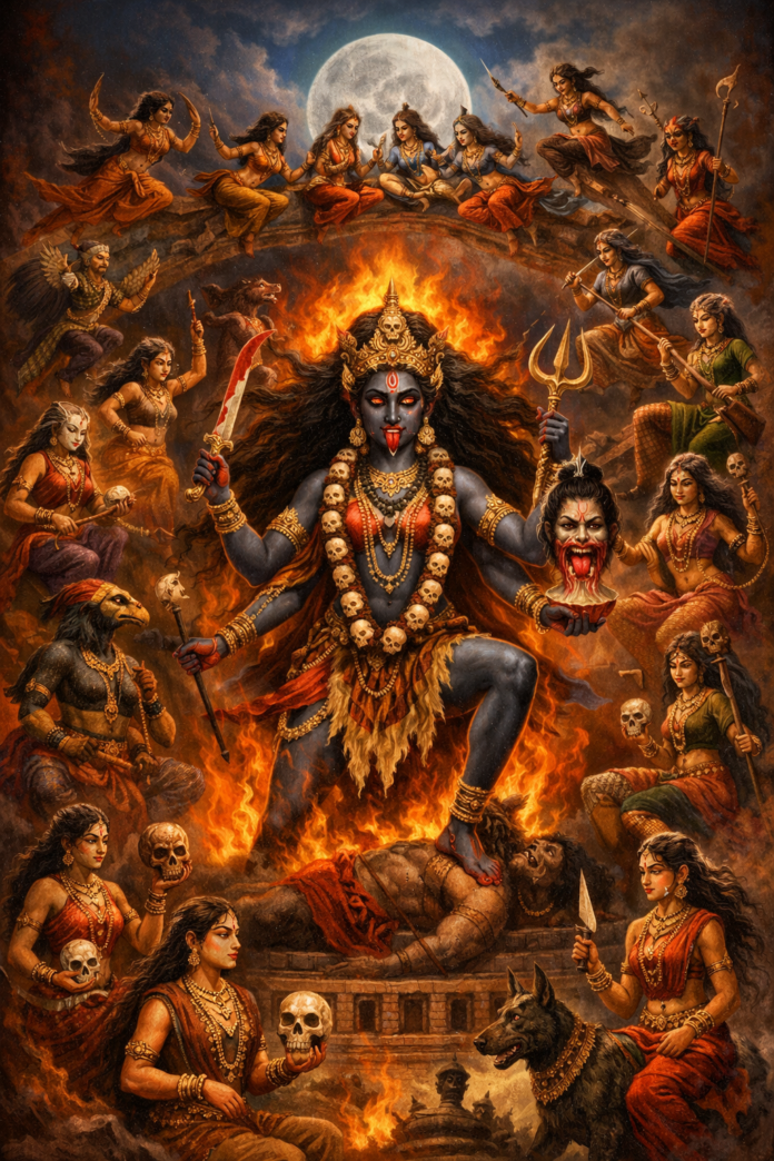जब माँ काली के क्रोध से चौसठ योगिनियाँ प्रकट हुईं, तब केवल असुरों का संहार नहीं हुआ, बल्कि ब्रह्मांडीय शक्ति-संतुलन की पुनर्स्थापना हुई। आज भी तांत्रिक परंपरा में योगिनियाँ साधना, सिद्धि और आत्मबोध का सर्वोच्च प्रतीक मानी जाती हैं। ये यह संदेश देती हैं कि जहाँ भय है, वहीं शक्ति का द्वार भी है। भारतीय सनातन परंपरा में यदि किसी विषय को सबसे अधिक रहस्यमय, गूढ़ और तांत्रिक माना गया है, तो वह है चौसठ योगिनियों का स्वरूप। ये योगिनियाँ केवल उग्र देवियाँ नहीं, बल्कि ब्रह्मांडीय शक्तियों, सूक्ष्म तत्वों और मानव चेतना के गहन स्तरों का सजीव प्रतीक हैं। शाक्त, तांत्रिक और पुराणिक परंपराओं में इनका उल्लेख अत्यंत सम्मान और रहस्य के साथ किया गया है।