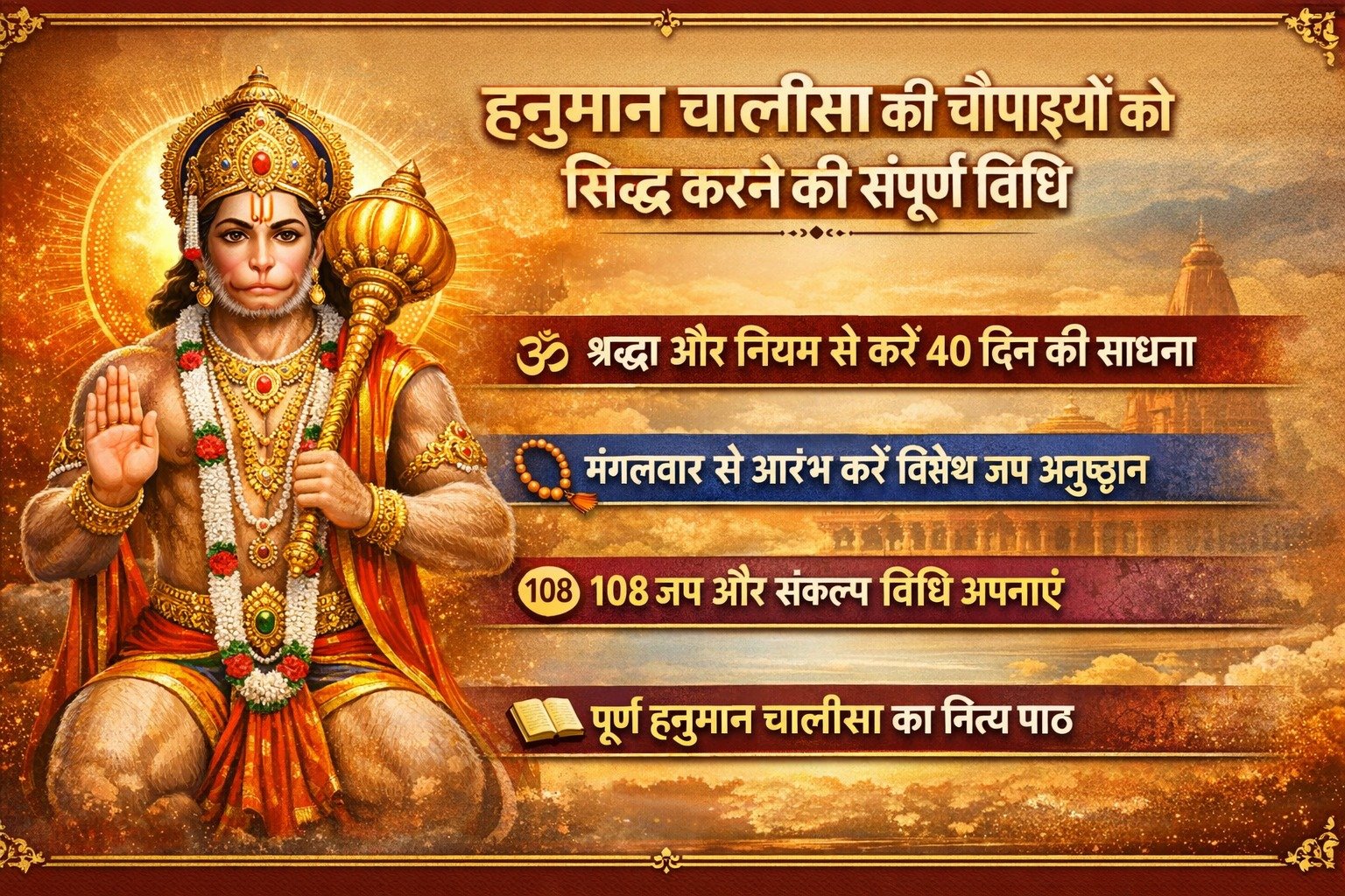 हनुमान चालीसा की चौपाइयों को “सिद्ध” करने का अर्थ तांत्रिक चमत्कार नहीं, बल्कि श्रद्धा, अनुशासन और निरंतर साधना के माध्यम से मन, वाणी और कर्म की शुद्धि करना है। सनातन परंपरा में मंत्र-साधना का मूल आधार नियम और निष्ठा है। हनुमान चालीसा तथा हनुमान की उपासना इसी भाव पर आधारित है।