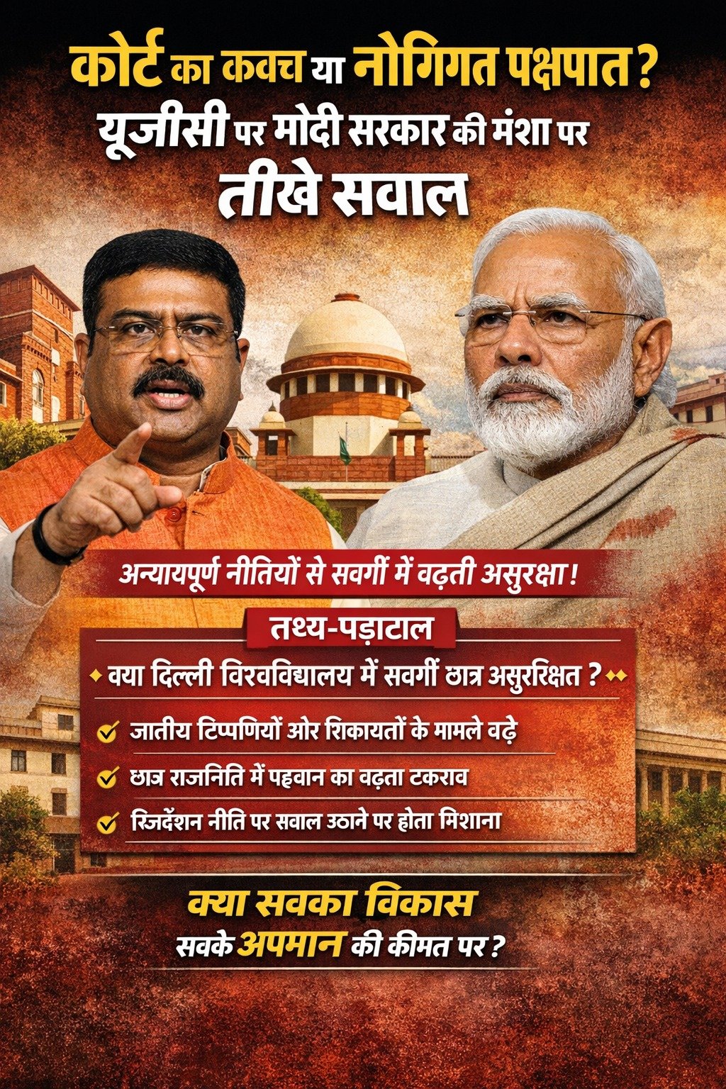 प्रधानमंत्री नरेंद्र मोदी के नेतृत्व में केंद्र सरकार “सबका साथ, सबका विकास, सबका विश्वास” का नारा देती रही है। यह नारा तभी विश्वसनीय होगा जब नीति-निर्माण में संतुलन स्पष्ट दिखे। सामाजिक न्याय का उद्देश्य ऐतिहासिक असमानताओं को दूर करना है, परंतु वर्तमान में किसी भी निर्दोष नागरिक को प्रक्रियात्मक असुरक्षा का सामना न करना पड़े, यह भी उतना ही आवश्यक है। यदि किसी वर्ग के भीतर यह धारणा बनती है कि उसकी चिंताओं या अधिकारों को पर्याप्त महत्व नहीं दिया जा रहा, तो लोकतांत्रिक विश्वास कमजोर हो सकता है। यूजीसी के नियमों पर उठ रहे प्रश्न राजनीतिक विरोध भर नहीं हैं; वे प्रक्रियात्मक न्याय और समान संरक्षण की मांग हैं। यदि सरकार वास्तव में सभी पक्षों के हितों की रक्षा करना चाहती है, तो उसे स्पष्ट रूप से बताना होगा कि शिकायत-निवारण तंत्र में निष्पक्षता, पारदर्शिता और जवाबदेही कैसे सुनिश्चित की जाएगी। झूठे आरोप सिद्ध होने पर दंडात्मक कार्रवाई के ठोस उदाहरण और सार्वजनिक आंकड़े भी विश्वास बहाल करने में सहायक हो सकते हैं। अदालत में मामला लंबित होना लोकतांत्रिक प्रक्रिया का हिस्सा है, किंतु नीतिगत मंशा की कसौटी अंततः कानून के संतुलन और उसके निष्पक्ष क्रियान्वयन से ही तय होगी। यही वह बिंदु है जहाँ मोदी सरकार को अपने इरादों को शब्दों से नहीं, ठोस कदमों से साबित करना होगा।