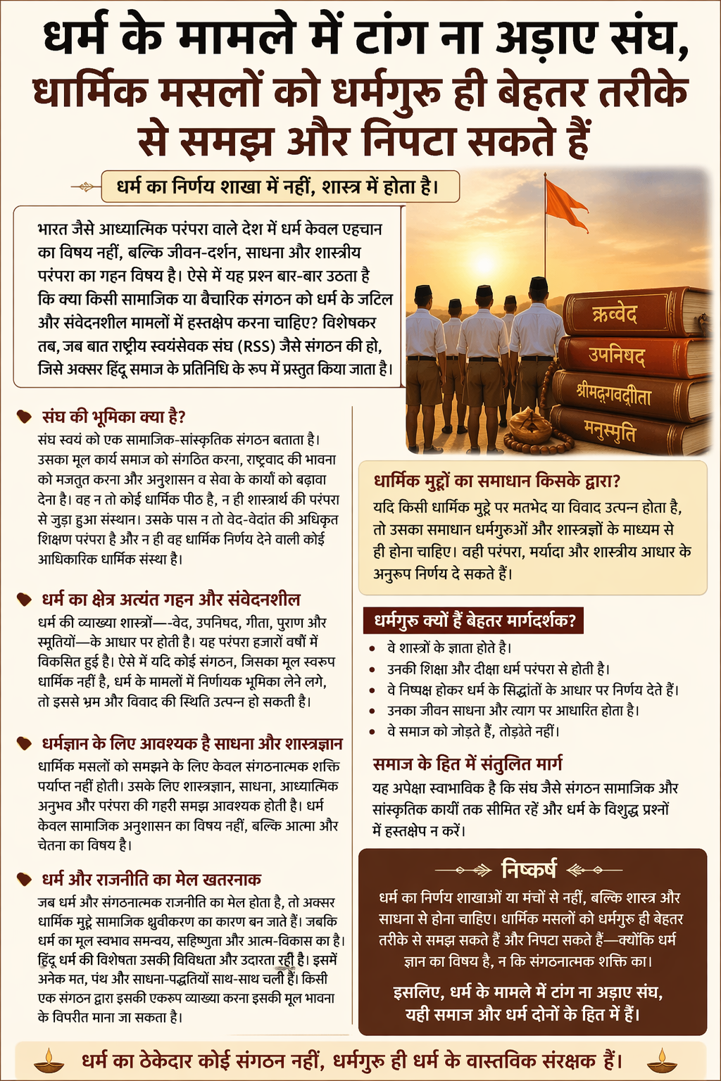 यदि किसी मंदिर, परंपरा, पूजा-पद्धति, शास्त्रीय विवाद या धार्मिक निर्णय का प्रश्न उठता है तो उसे धर्मगुरुओं के माध्यम से सुलझाया जाना चाहिए। धर्माचार्य ही यह बेहतर तरीके से समझ सकते हैं कि धर्म की वास्तविक भावना क्या है और उसका समाधान किस तरह होना चाहिए। संघ का काम समाज को संगठित करना हो सकता है, लेकिन धर्म के निर्णय देना या धर्म का ठेकेदार बनना न उसका अधिकार है, न उसकी क्षमता।